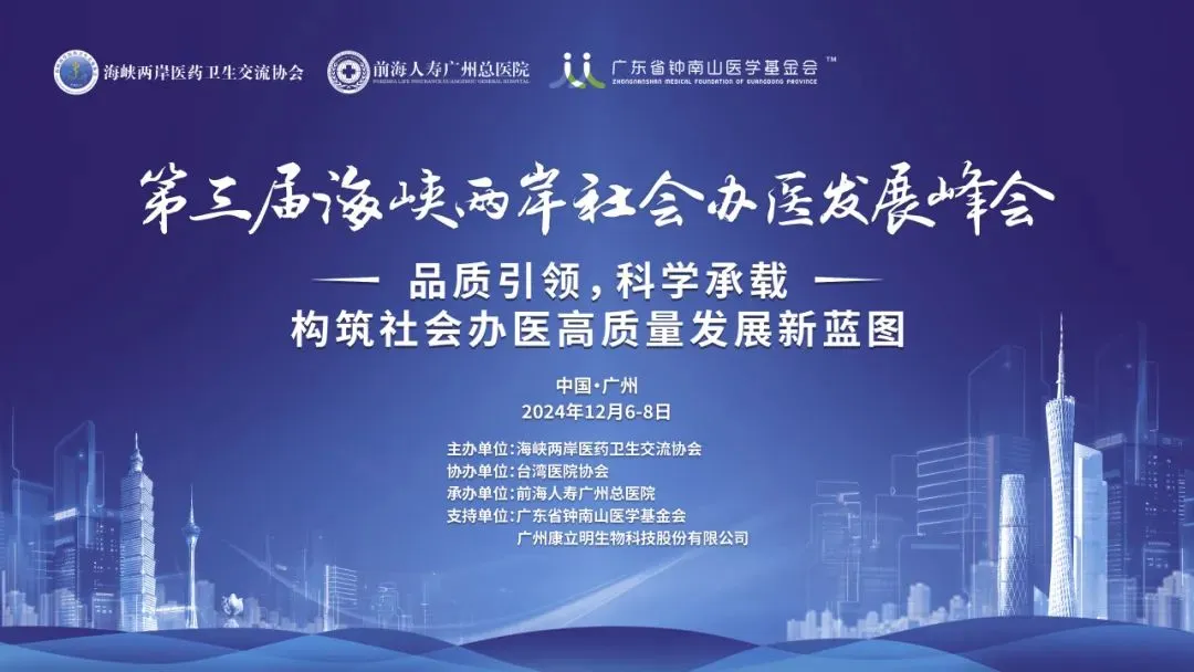 为深入学习贯彻党的二十届三中全会通过的《中共中央关于进一步全面深化改革、推进中国式现代化的决定》精神,更好地参与和推进健康中国建设,努力在探索社会办医健康规范及高质量发展新路上迈出更大步伐,2024年12月6日至8日,由海峡两岸医药卫生交流协会主办,台湾医院协会协办,前海人寿广州总医院承办,广东省钟南山医学基金会、广州康立明生物科技股份有限公司支持的第三届海峡两岸社会办医发展峰会在广州增城隆重召开,会议以“品质引领,科学承载,构筑社会办医高质量发展新蓝图”为主题。